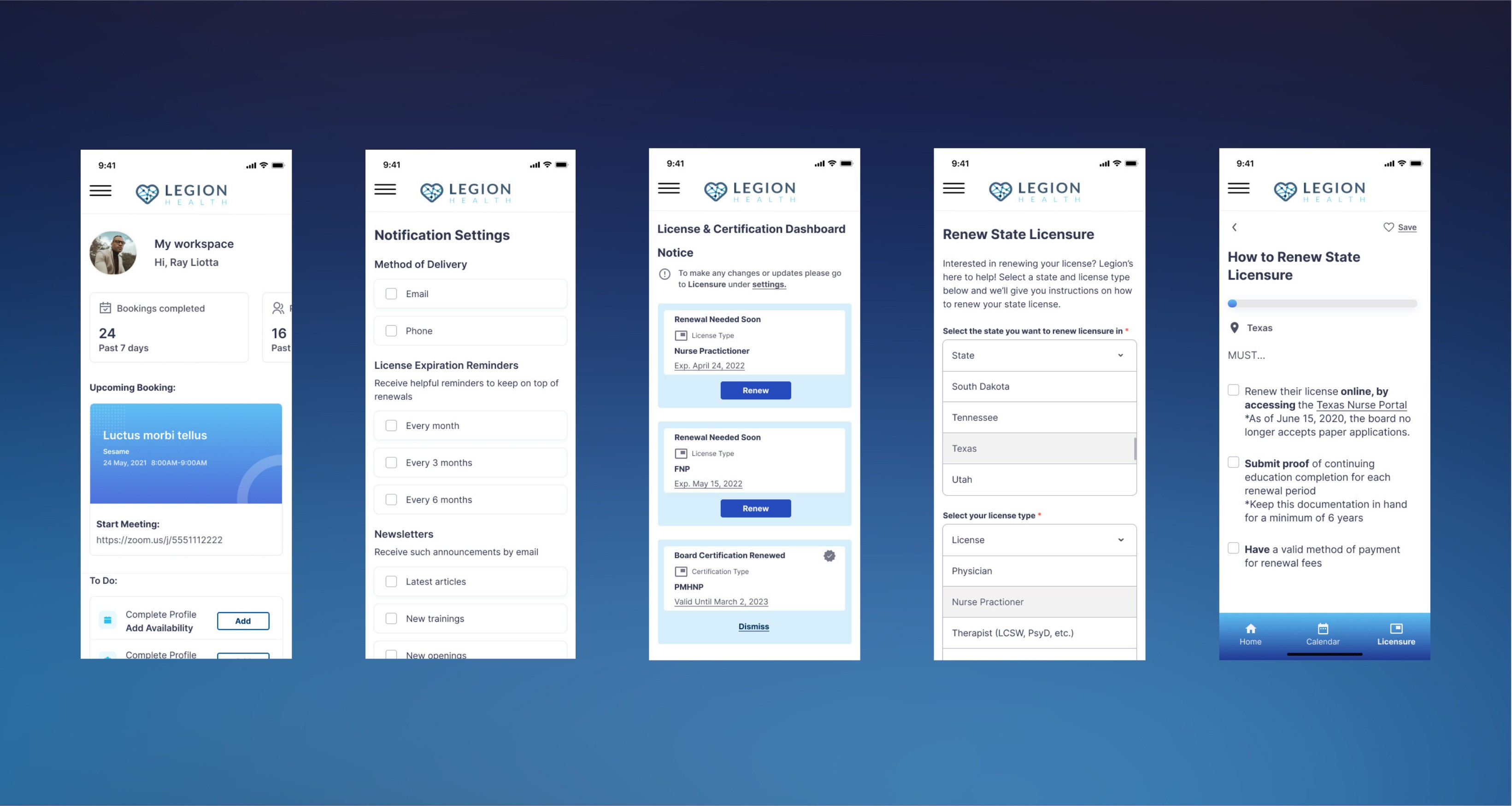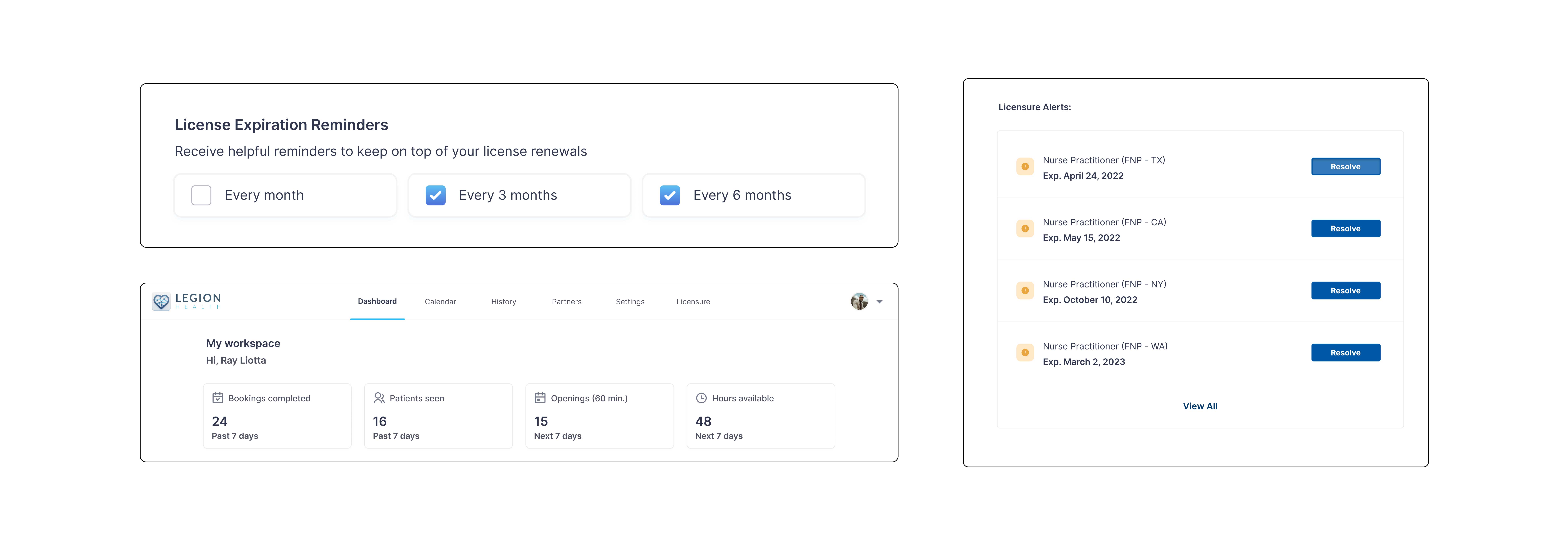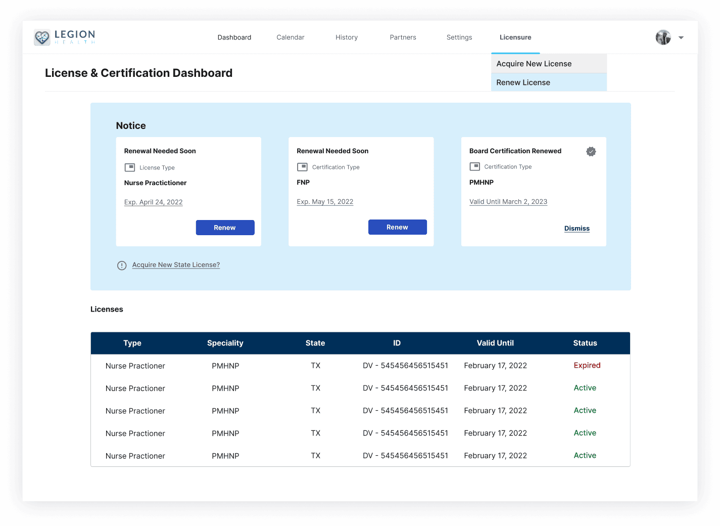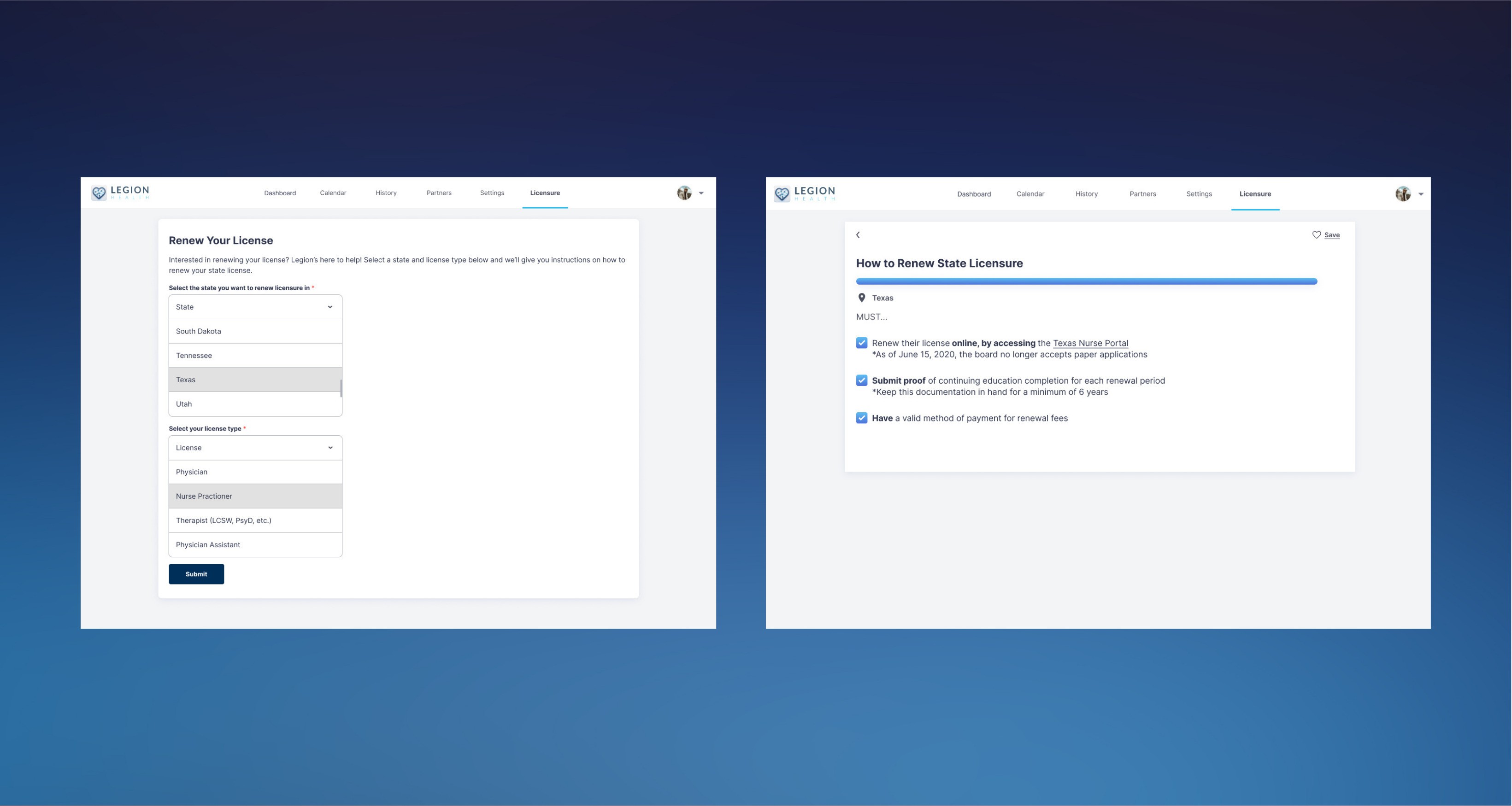 The final designs gave clinicians a single place to track, renew, and acquire state licenses, reducing a process that previously required navigating multiple state board websites individually. Findings and recommendations were formally presented to the Legion Health leadership team including the COO.