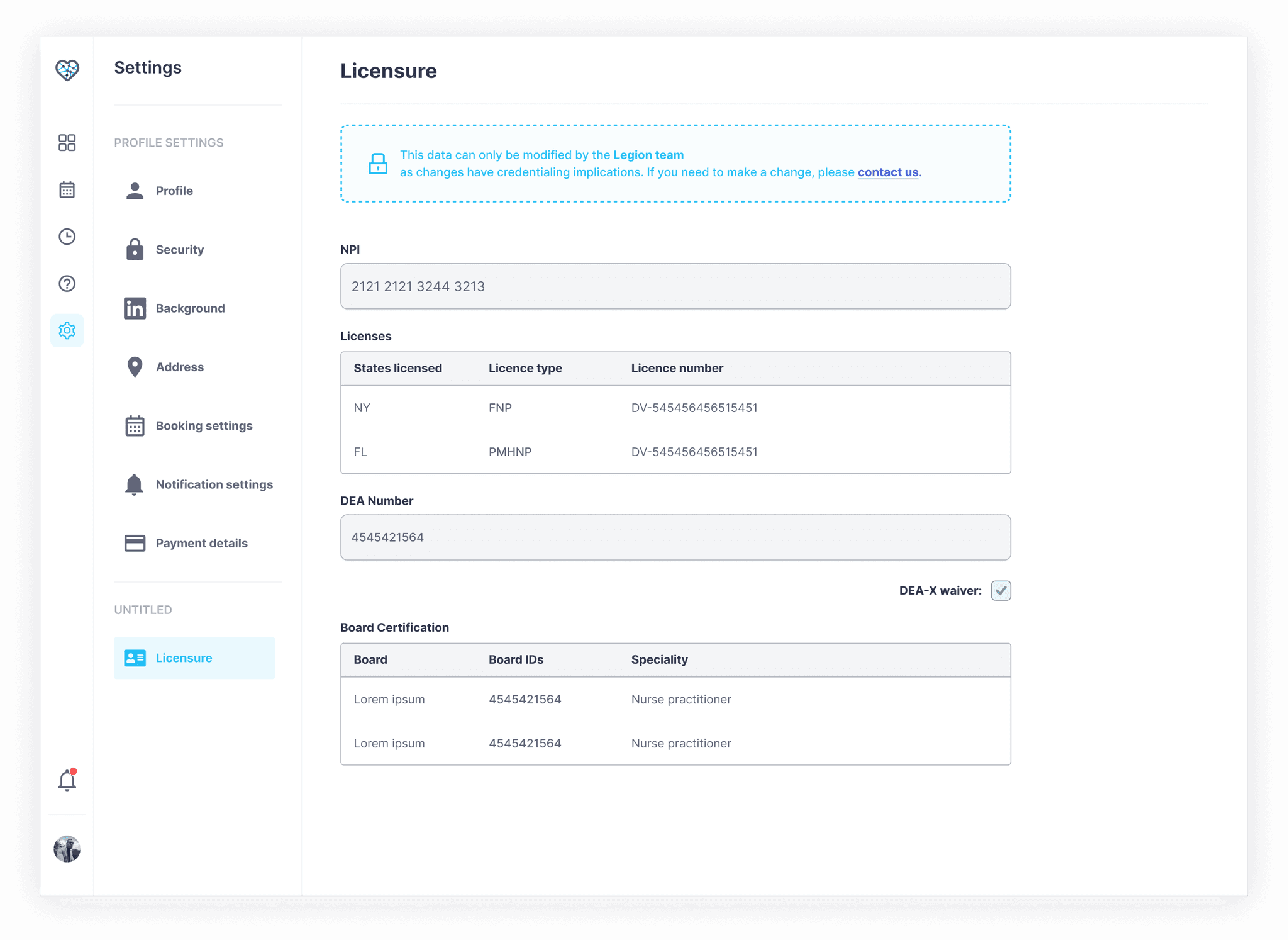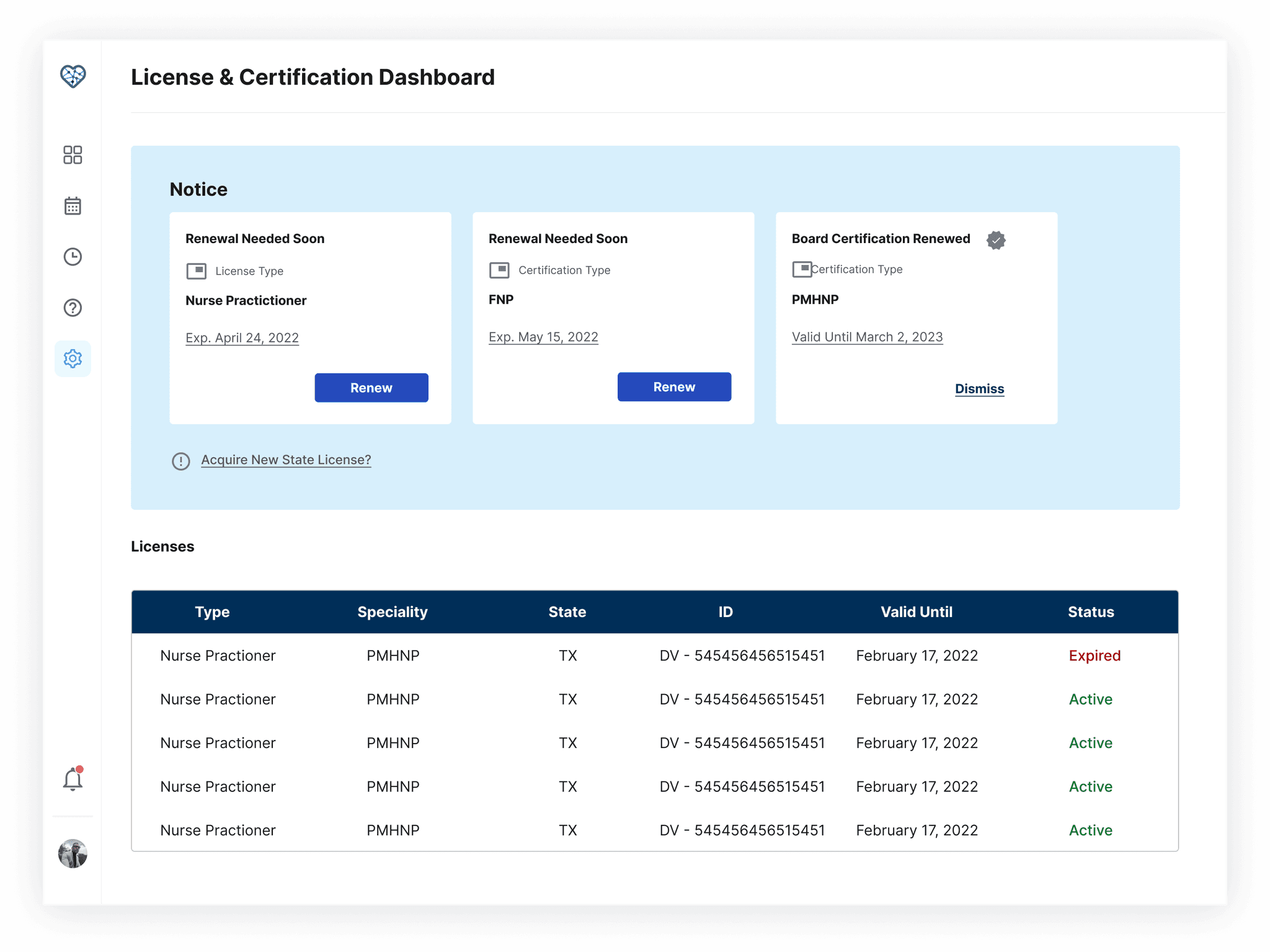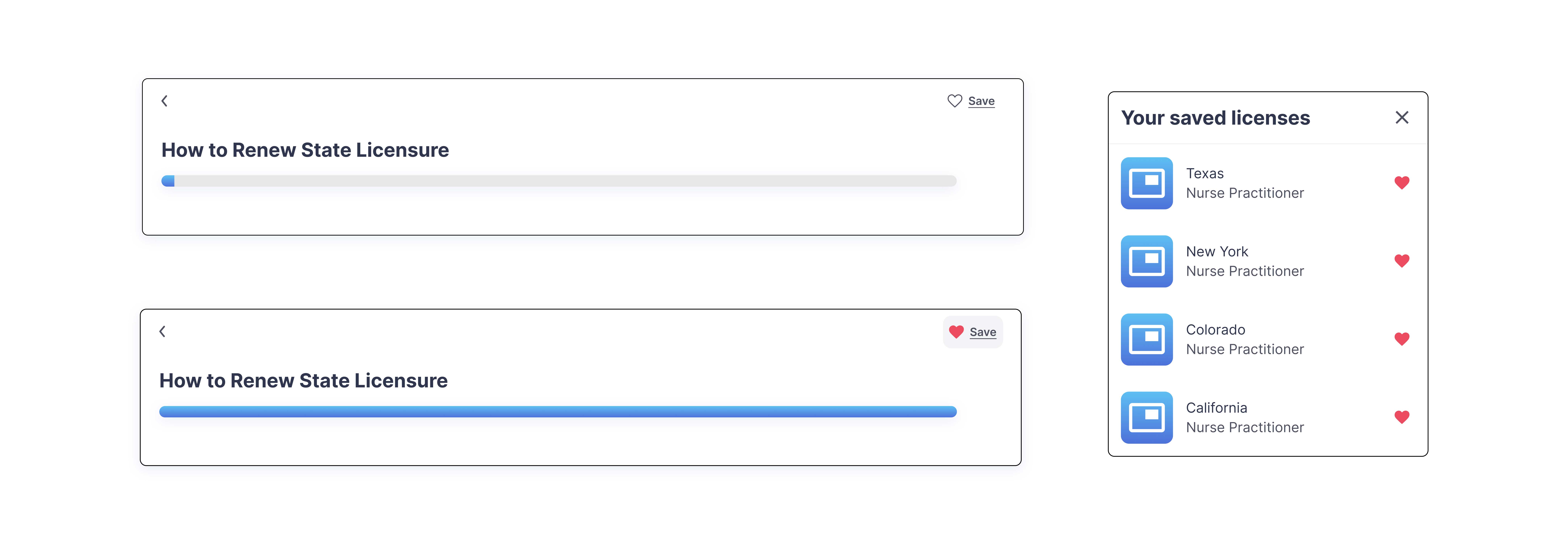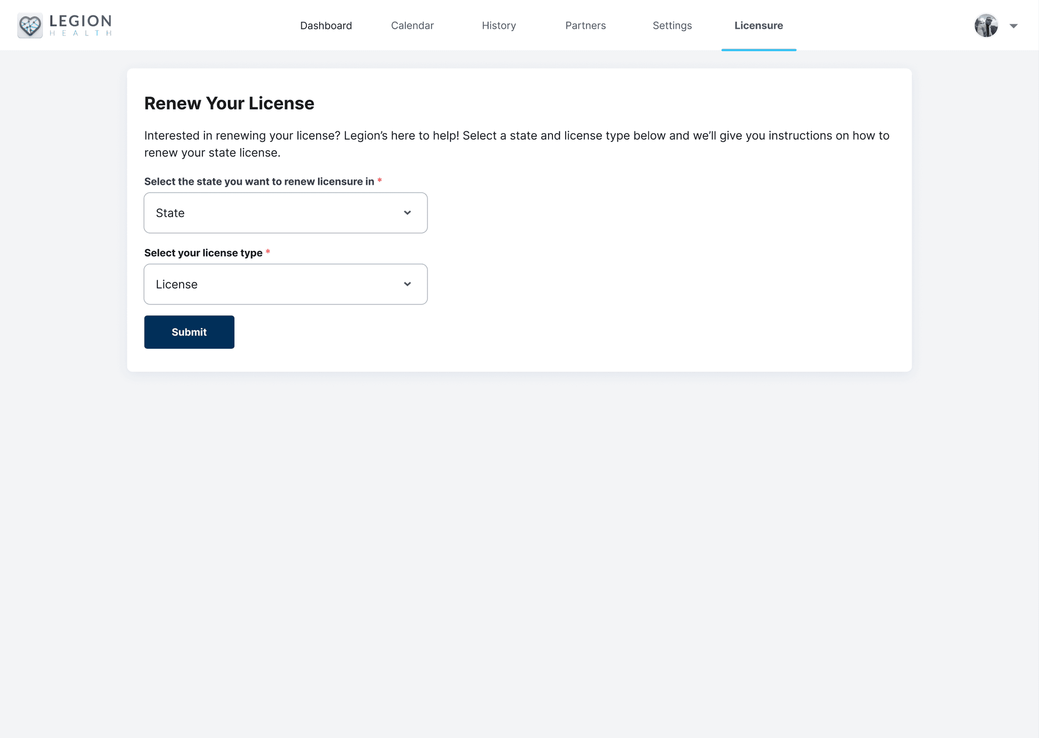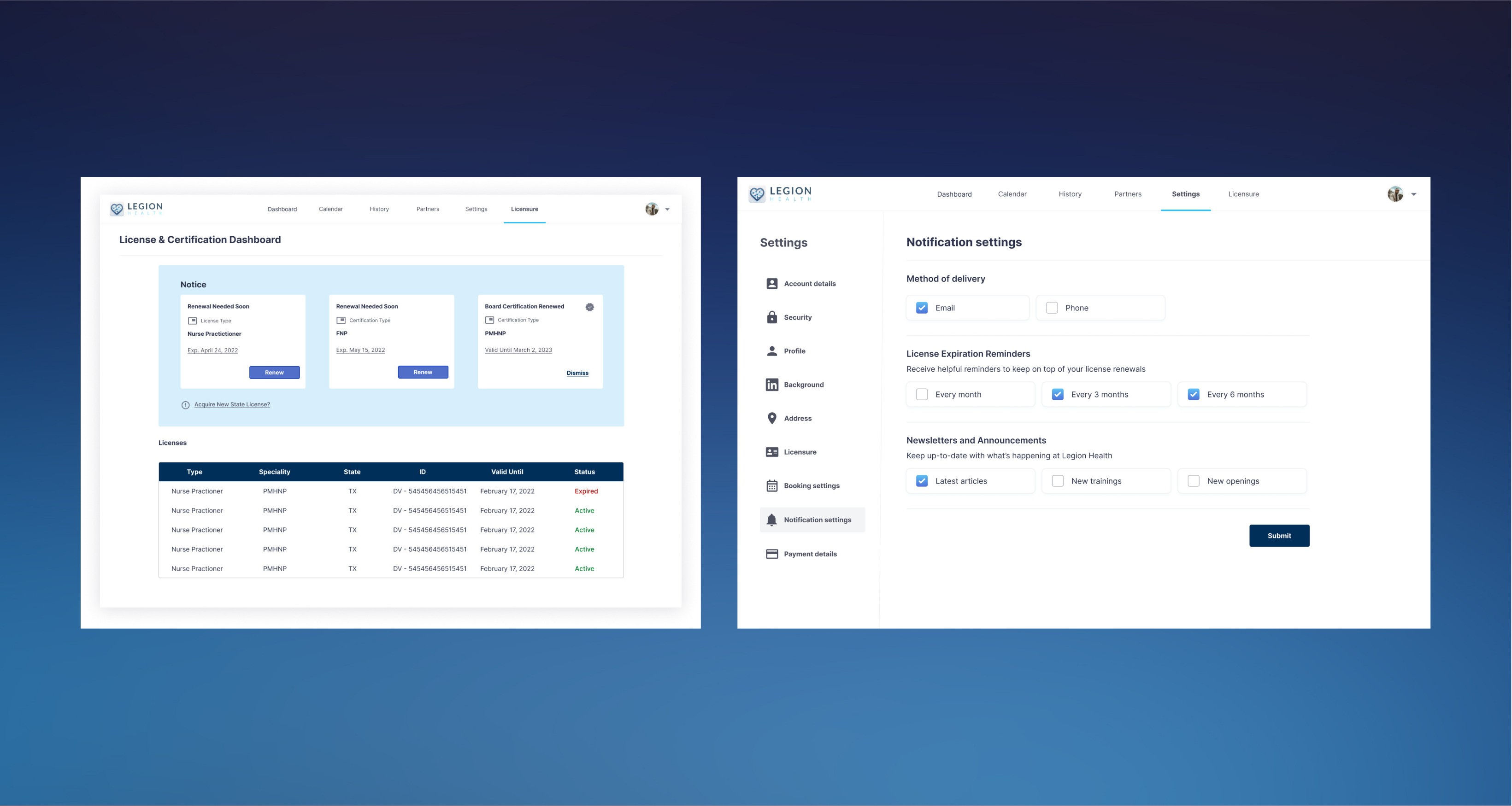 The final designs gave clinicians a single place to track, renew, and acquire state licenses, reducing a process that previously required navigating multiple state board websites individually. Findings and recommendations were formally presented to the Legion Health leadership team including the COO.