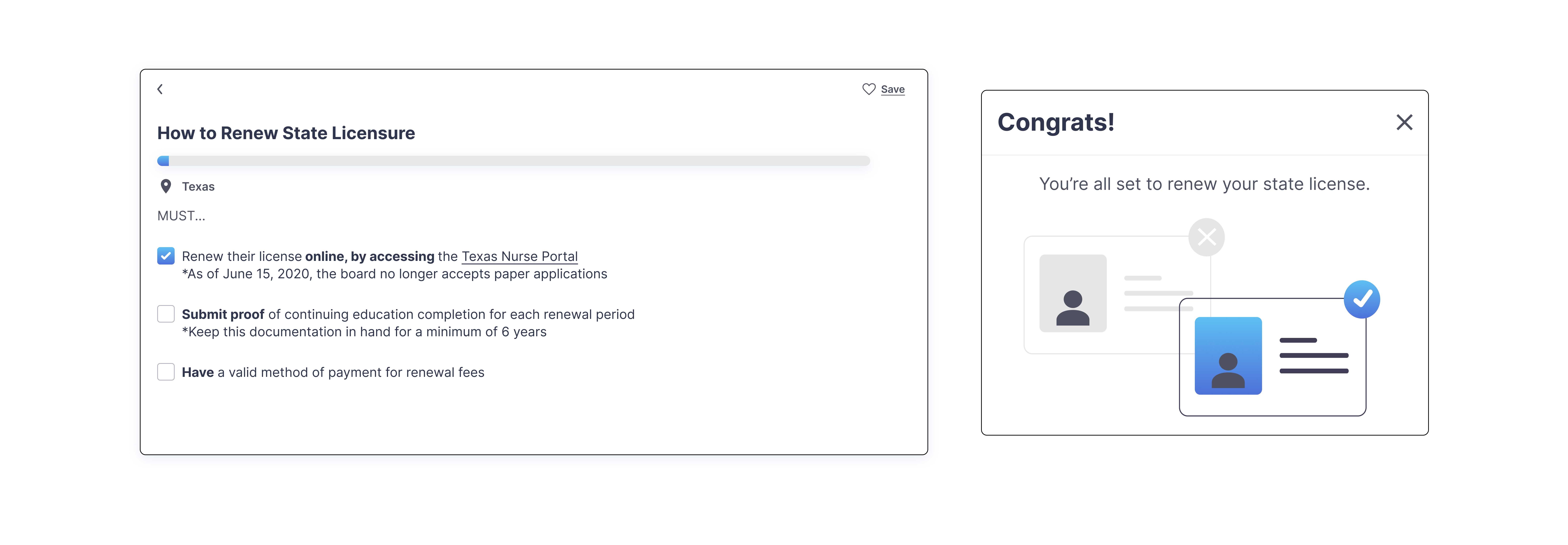 Midway through the project, stakeholders raised the idea of gamifying the licensure process to make it feel less tedious. I interpreted that as an opportunity and suggested the checklist format to give users a sense of small, trackable progress as they worked through requirements. In hindsight I would have explored this direction earlier and more deliberately, prototyping and testing a few different approaches rather than landing on one solution under time pressure.