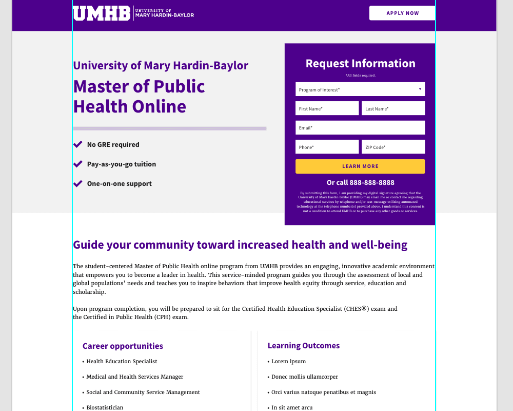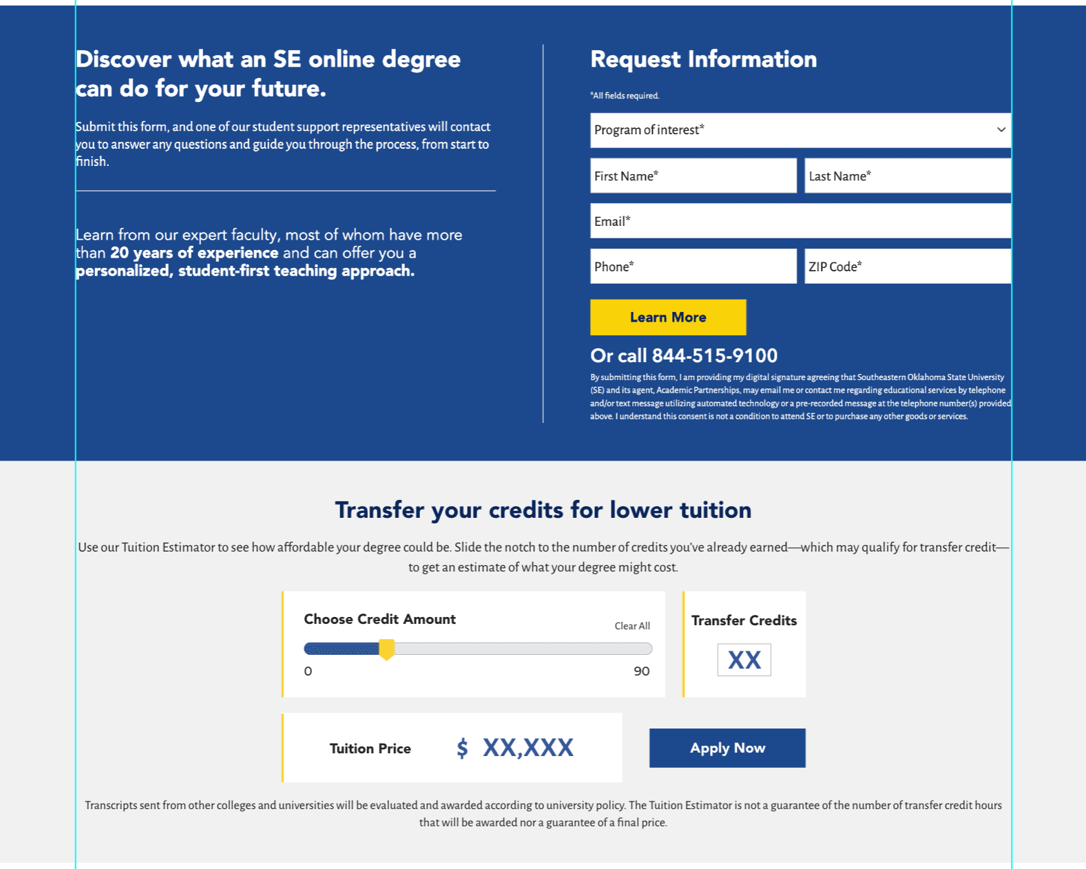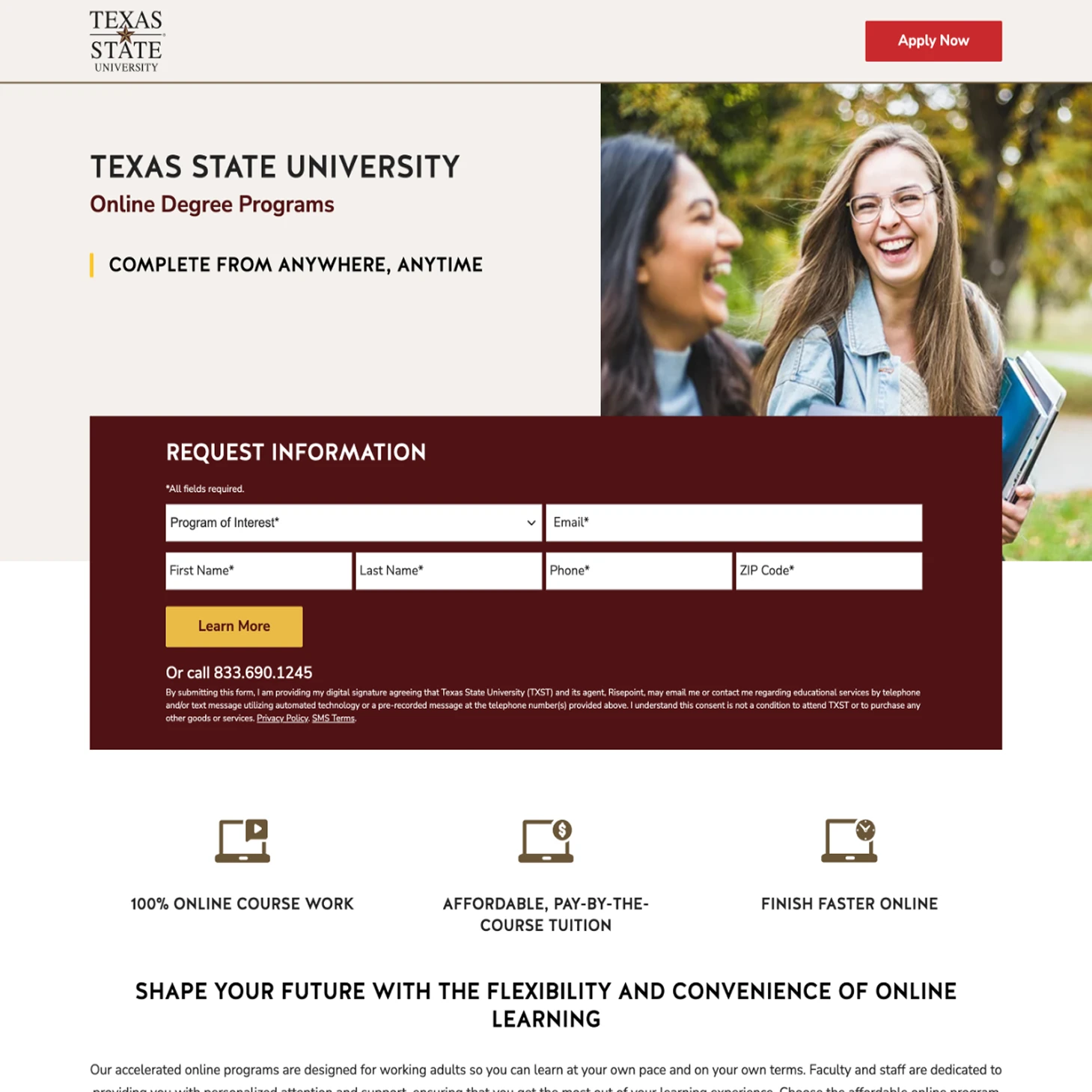 Optimizing student enrollment experiences by designing and testing partner site and landing page features to drive conversions for workforce-focused online programs.
