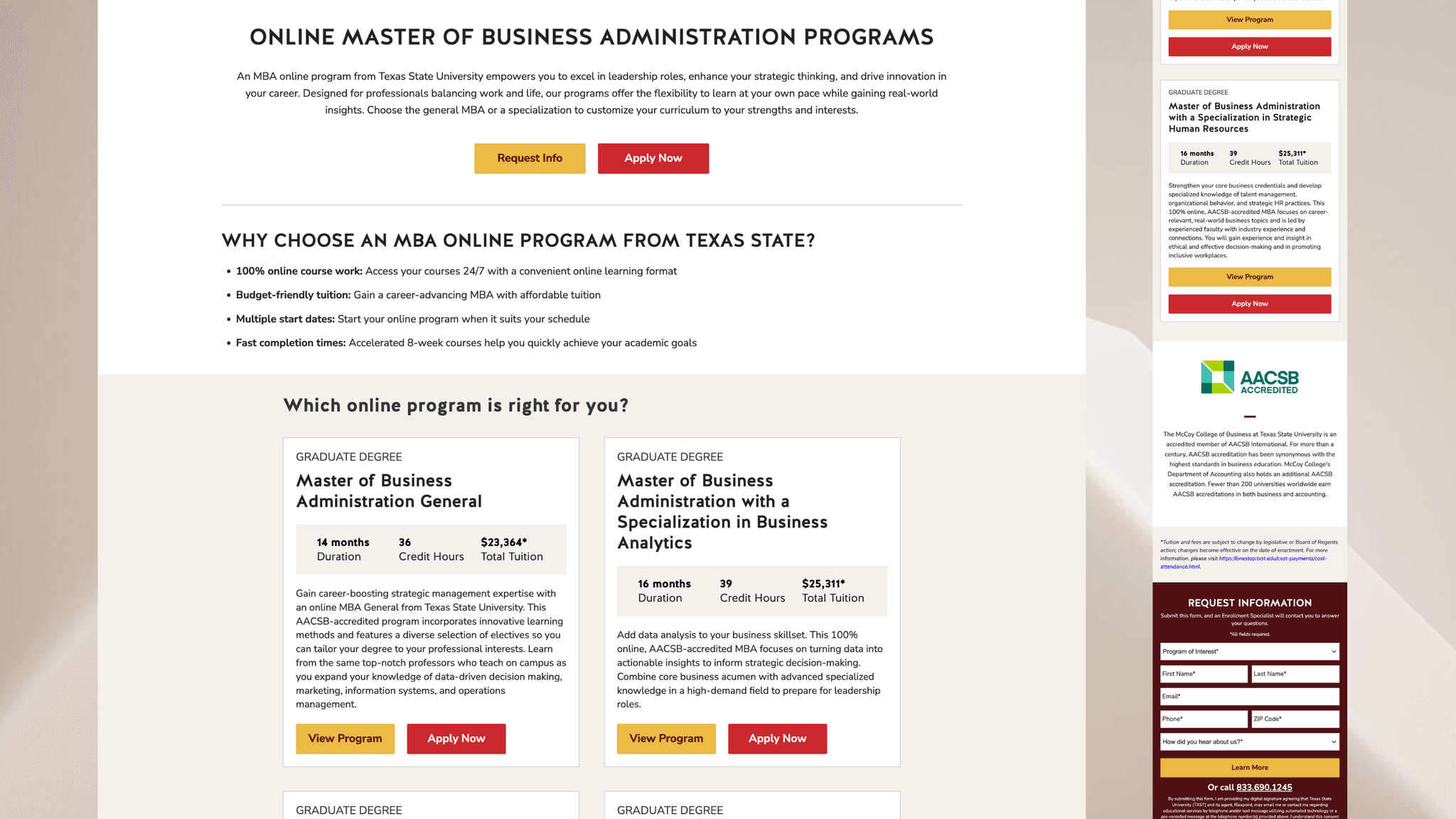 Hypothesis: If we change out the SAP section to be a more minimal show/hide section as with our other LPs, it will increase conversions because most MBA seekers are most interested in the types of MBAs available rather than seeing the full medium description.
