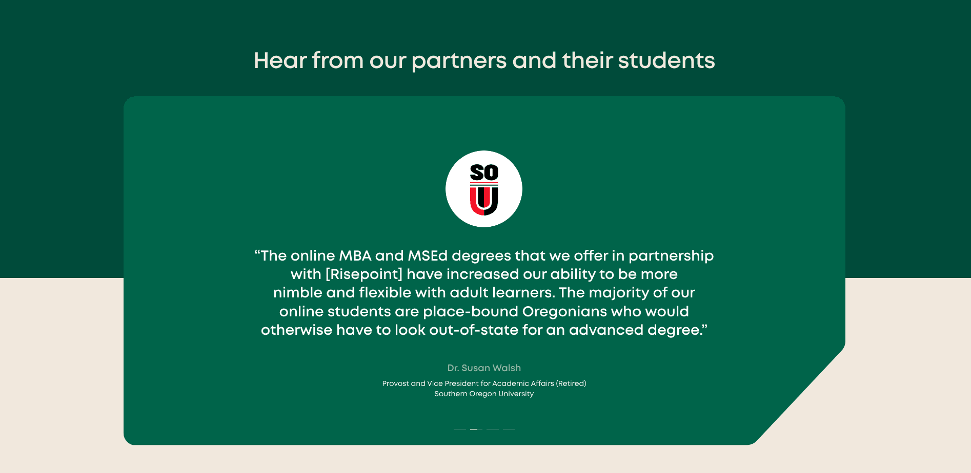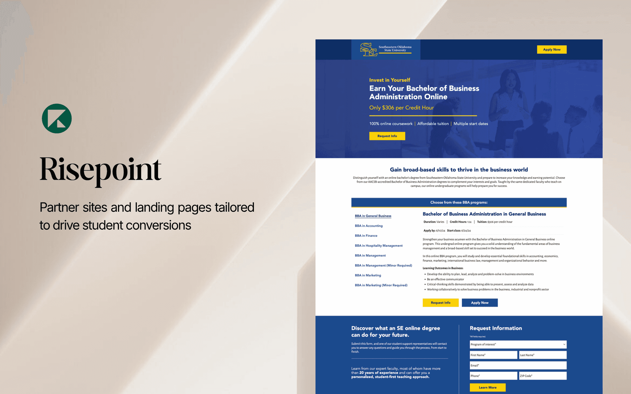 Risepoint is an education technology company partnering with over 125 regional public and private universities to expand access to affordable, workforce-relevant online programs. By helping universities reach new students, increase enrollments, and meet workforce needs, Risepoint aims to make high-quality education more accessible and deliver a strong return on investment for students.